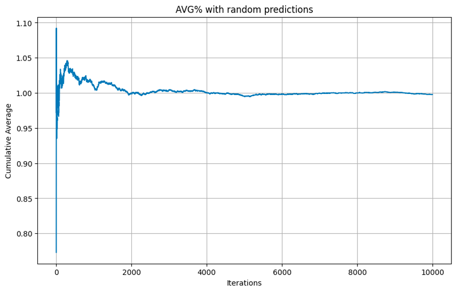To be sure, that this is not a random increase, I conducted a LLN simulation. The idea behind it was to utilise law of large number and get the average trade profit if we randomly filter-out trades based on the ration between "good" and "bad". As can be seen, the average profit per trade does not increased, giving one more sign of the model's effectiveness.