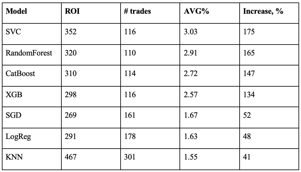 EnsemblingAnother thing to try was to ensemble top performing models. The idea is simple - working together, they will cover each one's errors and will help to increase the profit even more. Here is the results of conduction such an approach: